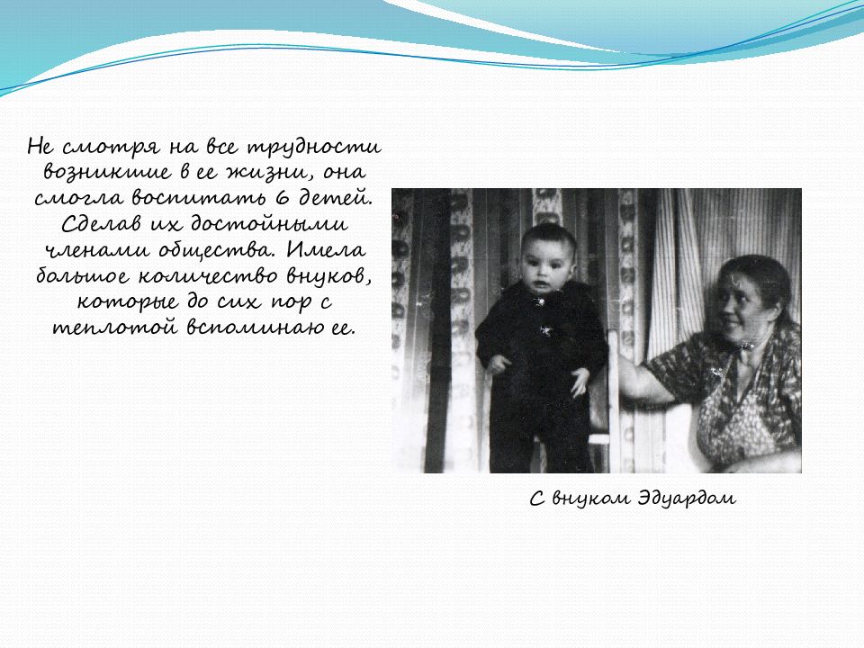 Не смотря на все трудности возникшие в ее жизни, она смогла воспитать 6 детей. Сделав их достойными членами общества. Имела большое количество внуков, которые до сих пор с теплотой вспоминаю ее. С внуком Эдуардом