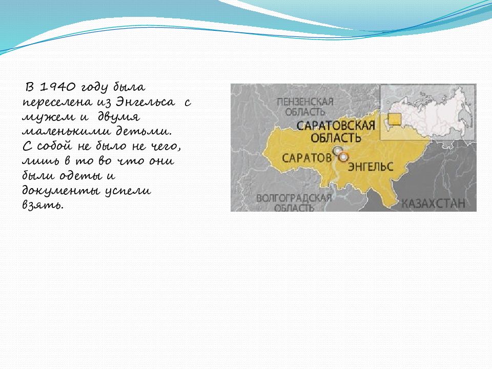 В 1940 году была переселена из Энгельса с мужем и двумя маленькими детьми. С собой не было не чего, лишь в то во что они были одеты и документы успели взять.