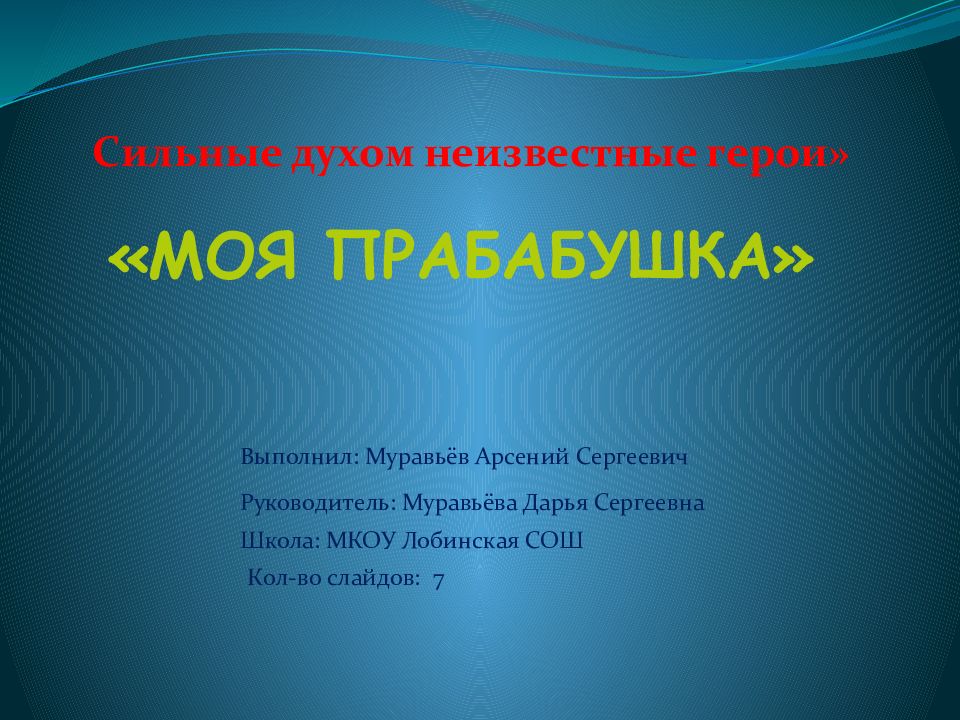 «Моя прабабушка» Выполнил: Муравьёв Арсений Сергеевич Руководитель: Муравьёва Дарья Сергеевна Сильные духом неизвестные герои» Школа: МКОУ Лобинская СОШ Кол-во слайдов: 7