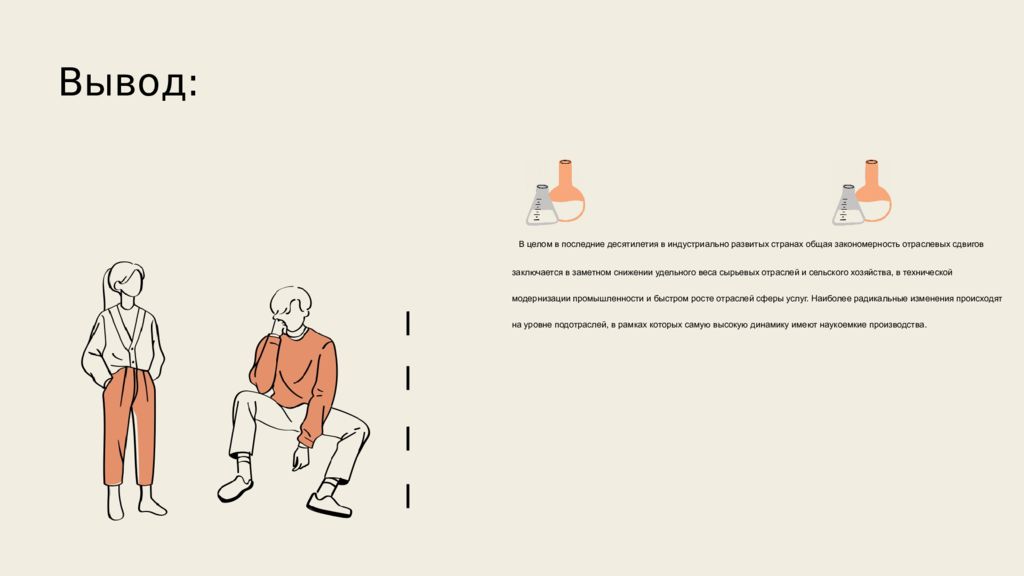 Вывод: В целом в последние десятилетия в индустриально развитых странах общая закономерность отраслевых сдвигов заключается в заметном снижении удельного веса сырьевых отраслей и сельского хозяйства, в технической модернизации промышленности и быстром росте отраслей сферы услуг. Наиболее радикальные изменения происходят на уровне подотраслей, в рамках которых самую высокую динамику имеют наукоемкие производства.