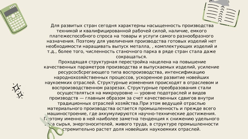 Для развитых стран сегодня характерны насыщенность производства техникой и квалифицированной рабочей силой, наличие, емкого платежеспособного спроса на товары и услуги самого разнообразного назначения. Поэтому для увеличения производства готовых изделий нет необходимости наращивать выпуск металла,, комплектующих изделий и т.д., более того, численность станочного парка в ряде стран стала даже сокращаться. Проходящая структурная перестройка нацелена на повышение качественных параметров производства и выпускаемых изделий, усиление ресурсосбсрегающего типа воспроизводства, интенсификацию народнохозяйственных процессов, ускоренное развитие новейших наукоемких отраслей. Структурные изменения происходят в отраслевом и воспроизводственном разрезах. Структурные преобразования стали осуществляться на микроуровне — уровне подотраслей и видов производств — главным образом за счет качественных сдвигов внутри традиционных отраслей хозяйства.При этом ведущей отраслью материального производства остается промышленность и прежде всего машиностроение, где аккумулируются научно-технические достижения. Поэтому именно в ней наиболее заметна тенденция к снижению удельного веса сырья, энергоносителей, живого труда, в структуре промышленности стремительно растет доля новейших наукоемких отраслей.