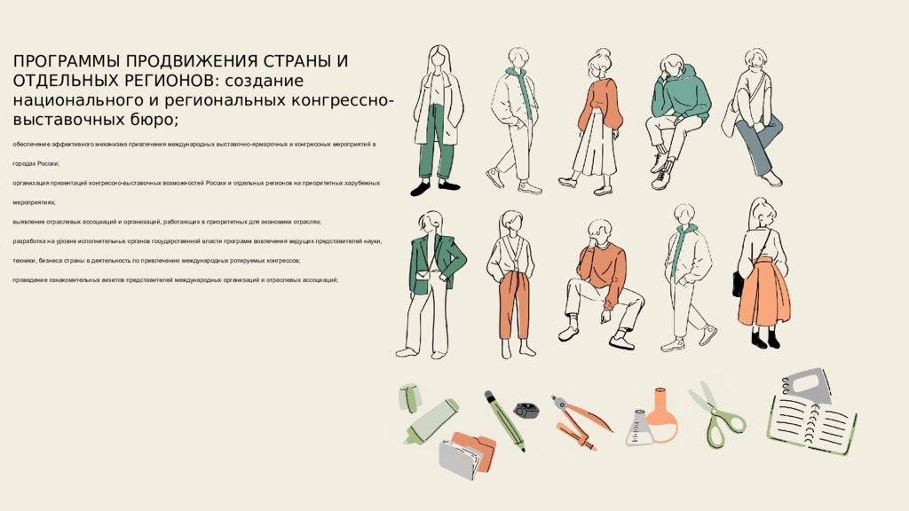ПРОГРАММЫ ПРОДВИЖЕНИЯ СТРАНЫ И ОТДЕЛЬНЫХ РЕГИОНОВ: создание национального и региональных конгрессно-выставочных бюро; обеспечение эффективного механизма привлечения международных выставочно-ярмарочных и конгрессных мероприятий в городaх России; организация презентаций конгрессно-выставочных возможностей России и отдельных регионов на приоритетных зарубежных мероприятиях; выявление отраслевых ассоциаций и организаций, работающих в приоритетных для экономики отраслях; разработка на уровне исполнительных органов государственной власти программ вовлечения ведущих представителей науки, техники, бизнеса страны в деятельность по привлечению международных ротируемых конгрессов; проведение ознакомительных визитов представителей международных организаций и отраслевых ассоциаций;