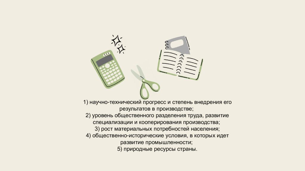1) научно-технический прогресс и степень внедрения его результатов в производстве; 2) уровень общественного разделения труда, развитие специализации и кооперирования производства; 3) рост материальных потребностей населения; 4) общественно-исторические условия, в которых идет развитие промышленности; 5) природные ресурсы страны.