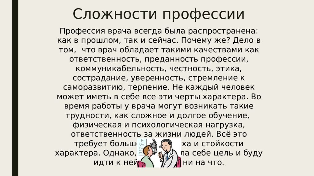 П рофессия врача всегда была распространена: как в прошлом, так и сейчас. Почему же? Дело в том, что врач обладает такими качествами как ответственность, преданность профессии, коммуникабельность, честность, этика, сострадание, уверенность, стремление к саморазвитию, терпение. Не каждый человек может иметь в себе все эти черты характера. Во время работы у врача могут возникать такие трудности, как сложное и долгое обучение, физическая и психологическая нагрузка, ответственность за жизни людей. Всё это требует большой силы духа и стойкости характера. Однако, я поставила себе цель и буду идти к ней несмотря ни на что.