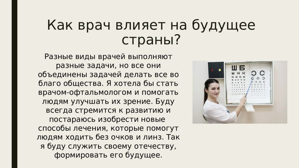 Разные виды врачей выполняют разные задачи, но все они объединены задачей делать все во благо общества. Я хотела бы стать врачом-офтальмологом и помогать людям улучшать их зрение. Буду всегда стремится к развитию и постараюсь изобрести новые способы лечения, которые помогут людям ходить без очков и линз. Так я буду служить своему отечеству, формировать его будущее.