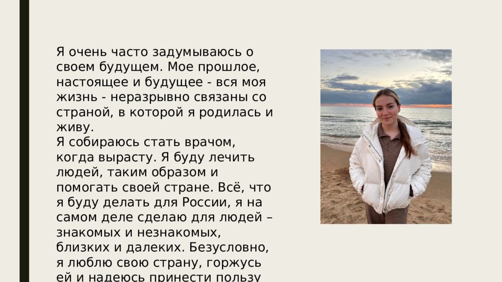Я очень часто задумываюсь о своем будущем. Мое прошлое, настоящее и будущее - вся моя жизнь - неразрывно связаны со страной, в которой я родилась и живу. Я собираюсь стать врачом, когда вырасту. Я буду лечить людей, таким образом и помогать своей стране. Всё, что я буду делать для России, я на самом деле сделаю для людей – знакомых и незнакомых, близких и далеких. Безусловно, я люблю свою страну, горжусь ей и надеюсь принести пользу людям, которые в ней живут.