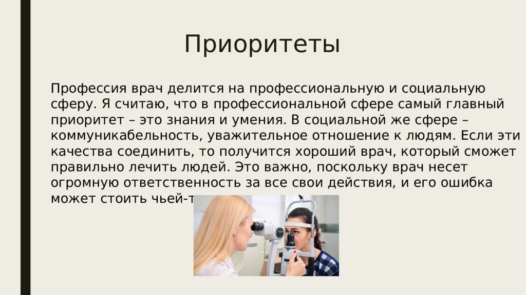 Профессия врач делится на профессиональную и социальную сферу. Я считаю, что в профессиональной сфере самый главный приоритет – это знания и умения. В социальной же сфере – коммуникабельность, уважительное отношение к людям. Если эти качества соединить, то получится хороший врач, который сможет правильно лечить людей. Это важно, поскольку врач несет огромную ответственность за все свои действия, и его ошибка может стоить чьей-то жизни.