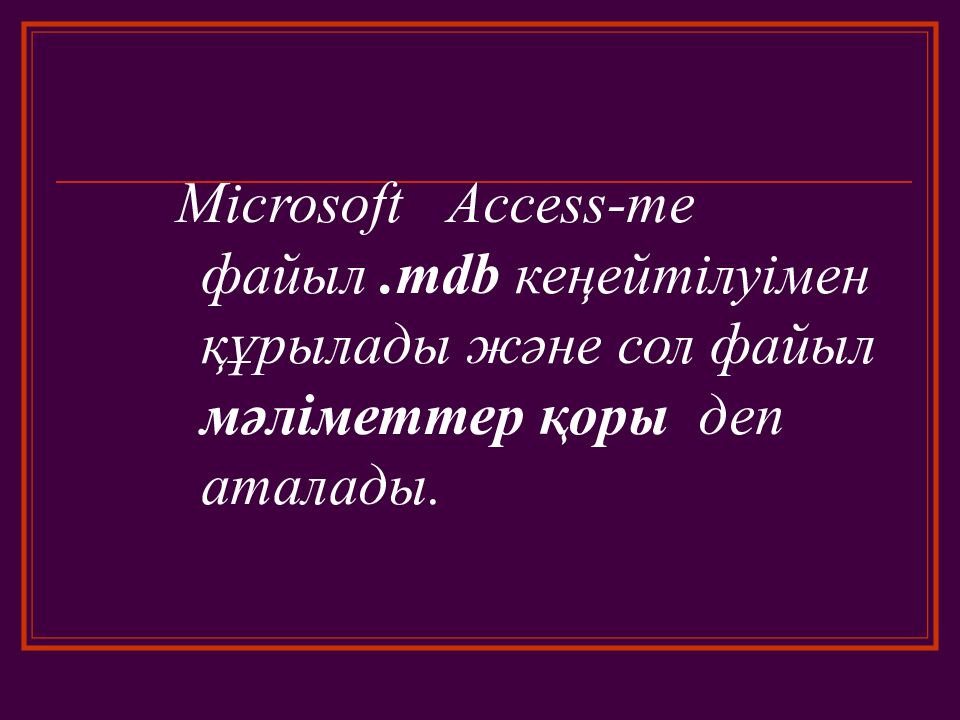 Microsoft Access -те файыл. mdb кеңейтілуімен құрылады және сол файыл мәліметтер қоры деп аталады.