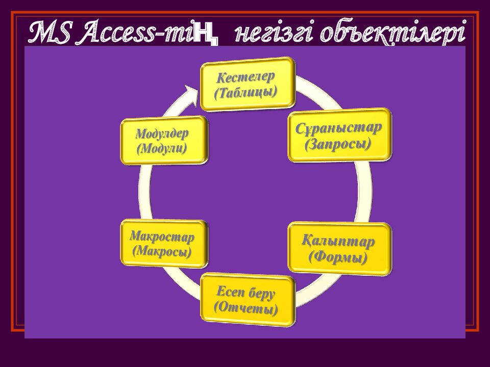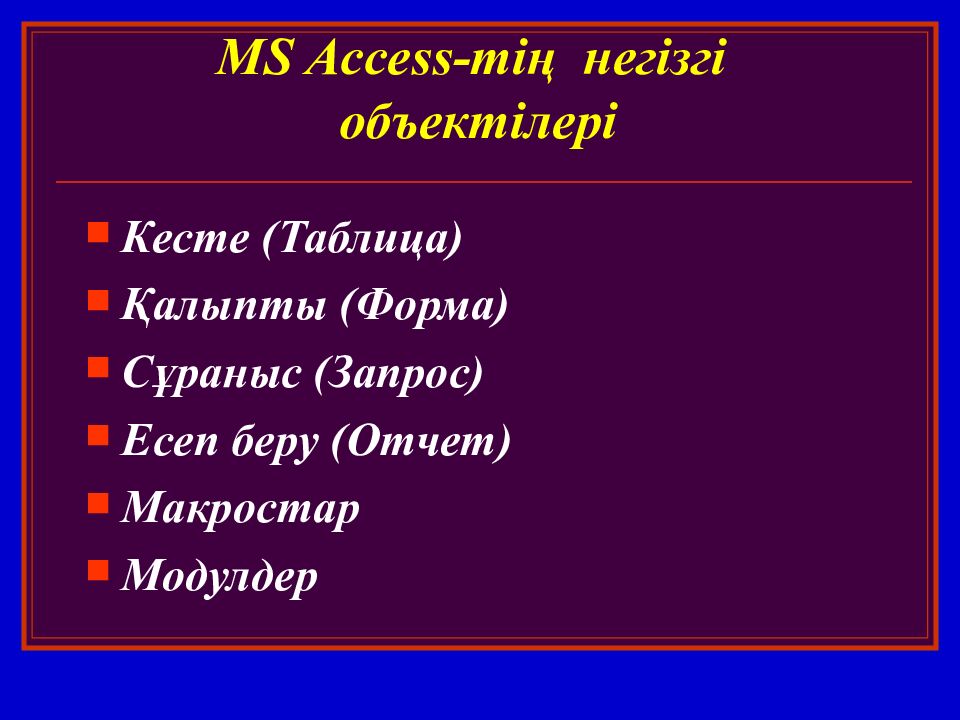 MS Access -тің негізгі объектілері Кесте (Таблица) Қалыпты (Форм а ) Сұраныс (Запрос) Есеп беру (Отчет) Макрос тар Модул дер