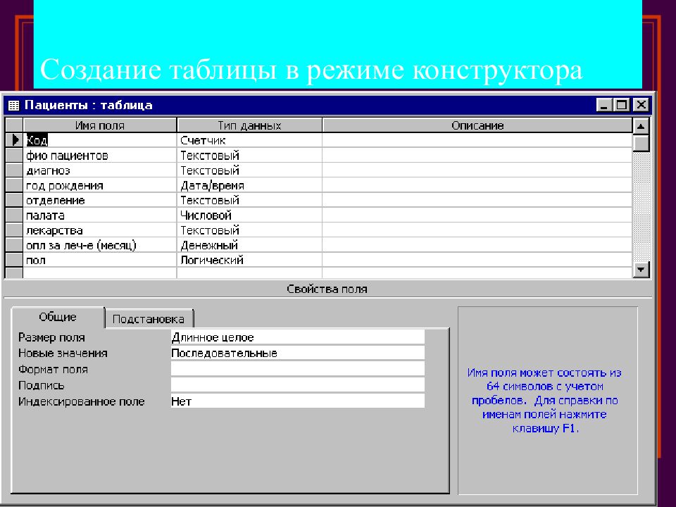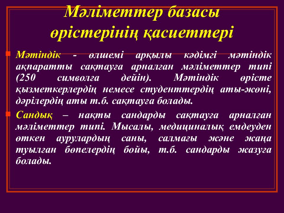 Мәліметтер базасы өрістерінің қасиеттері Мәтіндік - өлшемі арқылы кәдімгі мәтіндік ақпаратты сақтауға арналған мәліметтер типі (250 символға дейін). Мәтіндік өрісте қызметкерлердің немесе студенттердің аты-жөні, дәрілердің аты т.б. сақтауға болады. Сандық – нақты сандарды сақтауға арналған мәліметтер типі. Мысалы, медициналық емдеуден өткен аурулардың саны, салмағы және жаңа туылған бөпелердің бойы, т.б. сандарды жазуға болады.