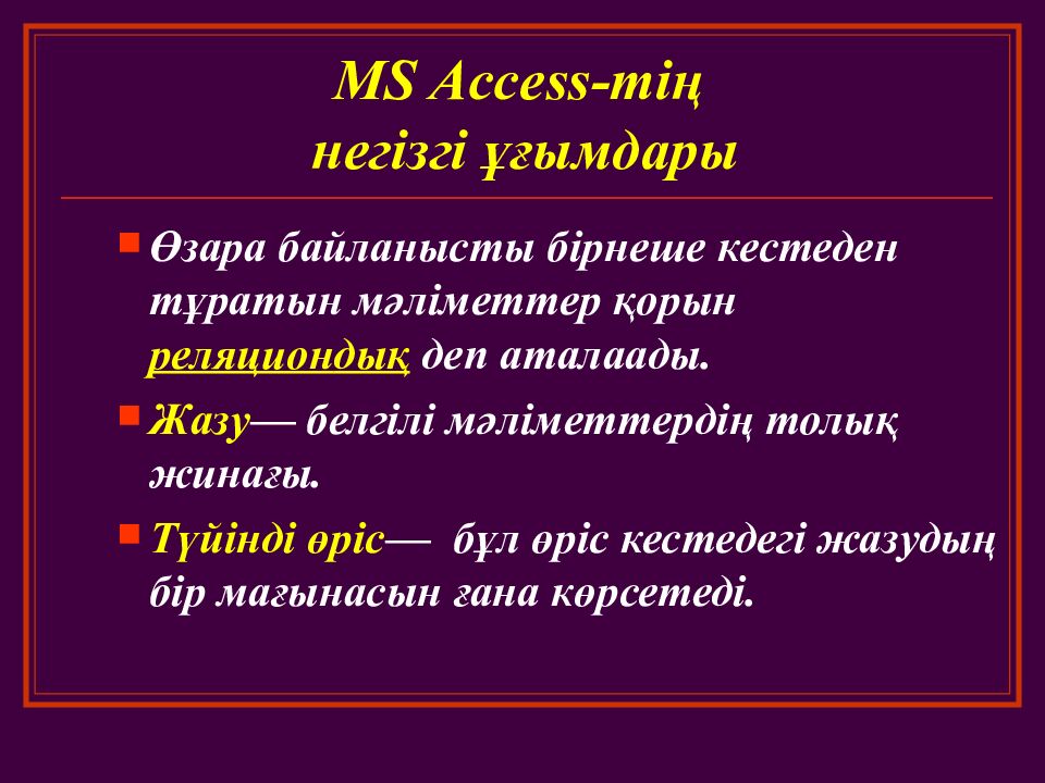 MS Access -тің негізгі ұғымдары Өзара байланысты бірнеше кестеден тұратын мәліметтер қорын реляцион дық деп аталаады. Жазу — белгілі мәліметтердің толық жинағы. Түйінді өріс — бұл өріс кестедегі жазудың бір мағынасын ғана көрсетеді.