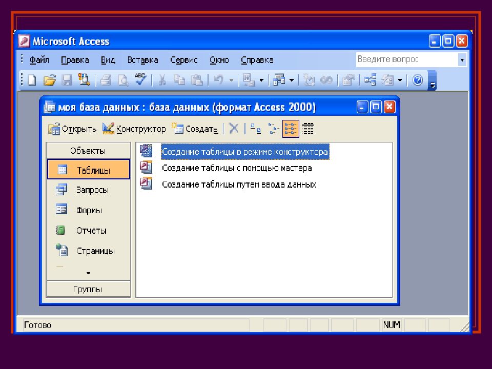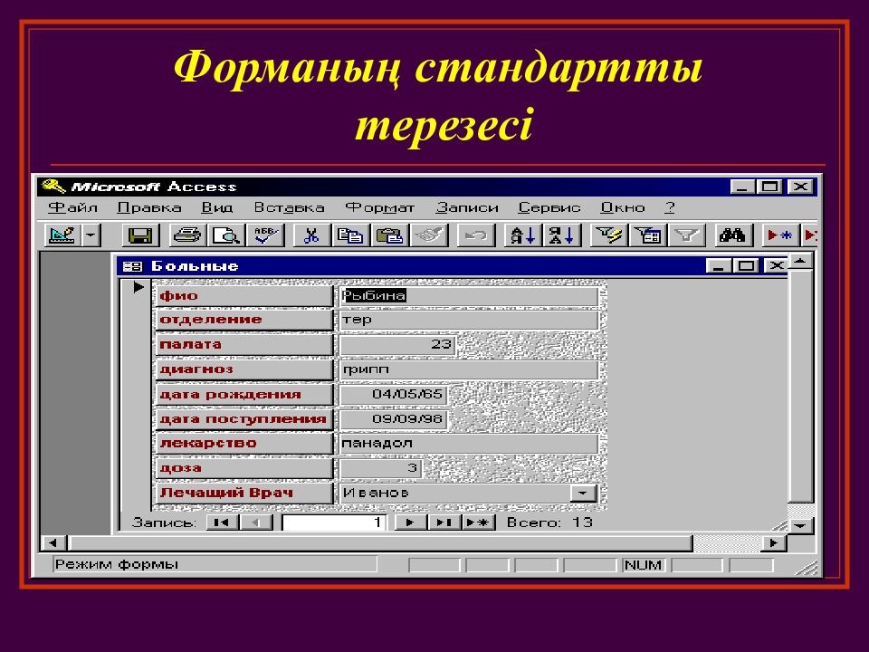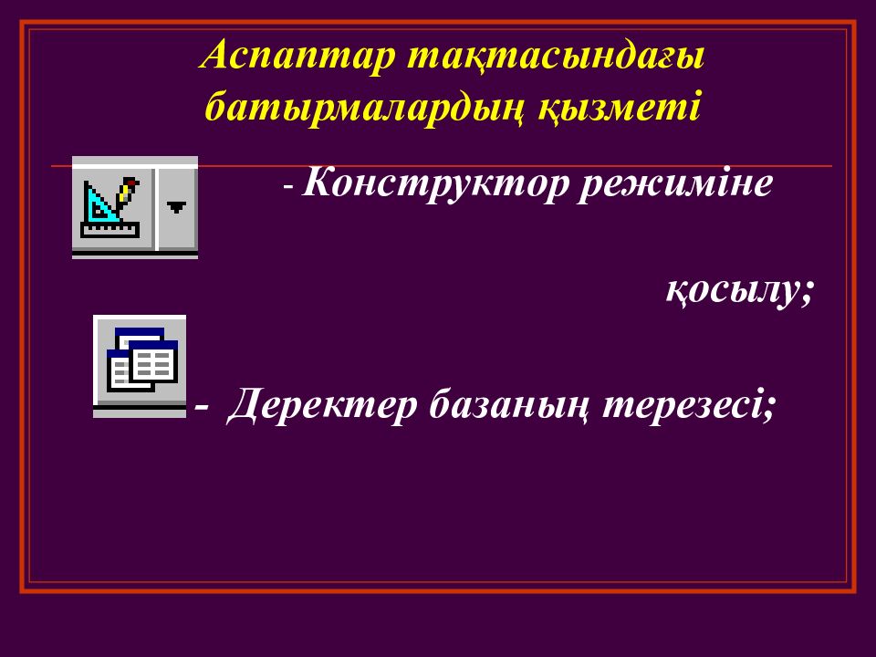 Аспаптар тақтасындағы батырмалардың қызметі - Конструктор режиміне қосылу ; - Деректер базаның терезесі;