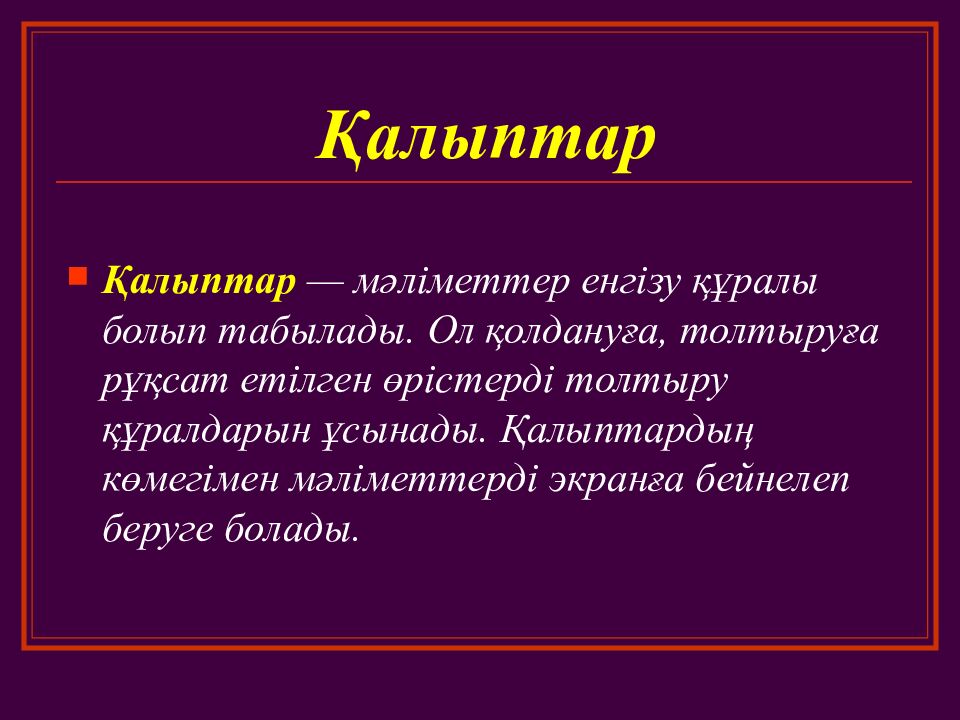 Қалыптар Қалыптар — мәліметтер енгізу құралы болып табылады. Ол қолдануға, толтыруға рұқсат етілген өрістерді толтыру құралдарын ұсынады. Қалыптардың көмегімен мәліметтерді экранға бейнелеп беруге болады.