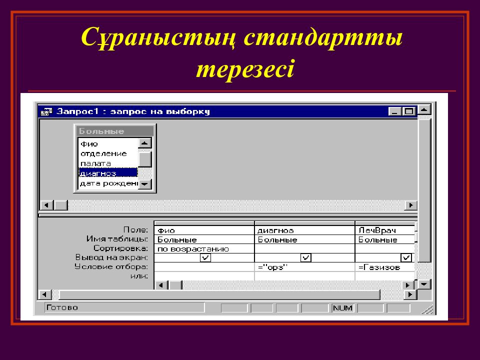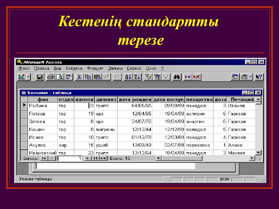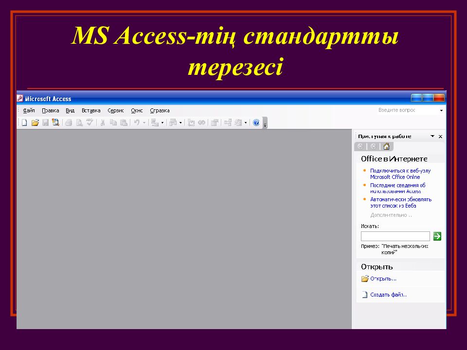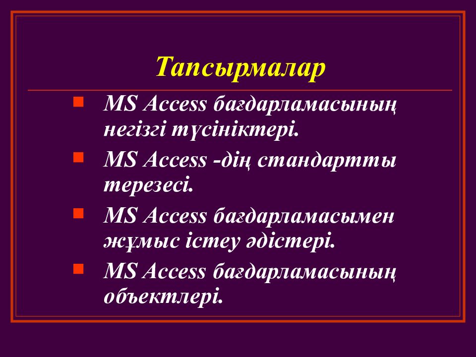 Тапсырмалар MS Access бағдарламасының негізгі түсініктері. MS Access -дің стандартты терезесі. MS Access бағдарламасымен жұмыс істеу әдістері. MS Access бағдарламасының объектлері.