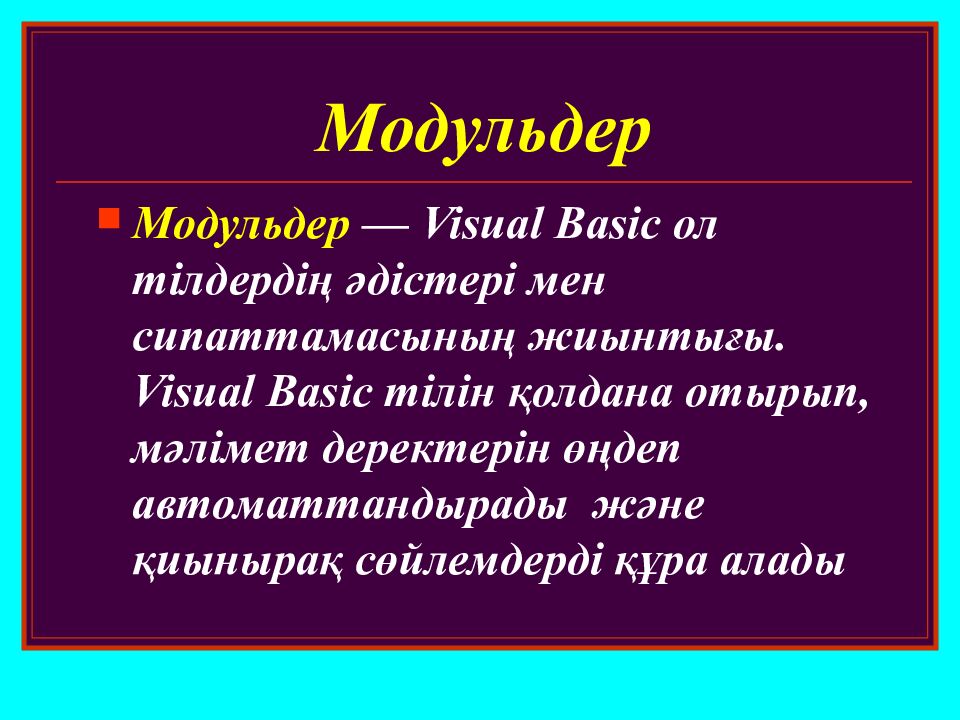 Модульдер Модульдер — Visual Basic ол тілдердің әдістері мен сипаттамасының жиынтығы. Visual Basic тілін қолдана отырып, мәлімет деректерін өңдеп автоматтандырады және қиынырақ сөйлемдерді құра алады