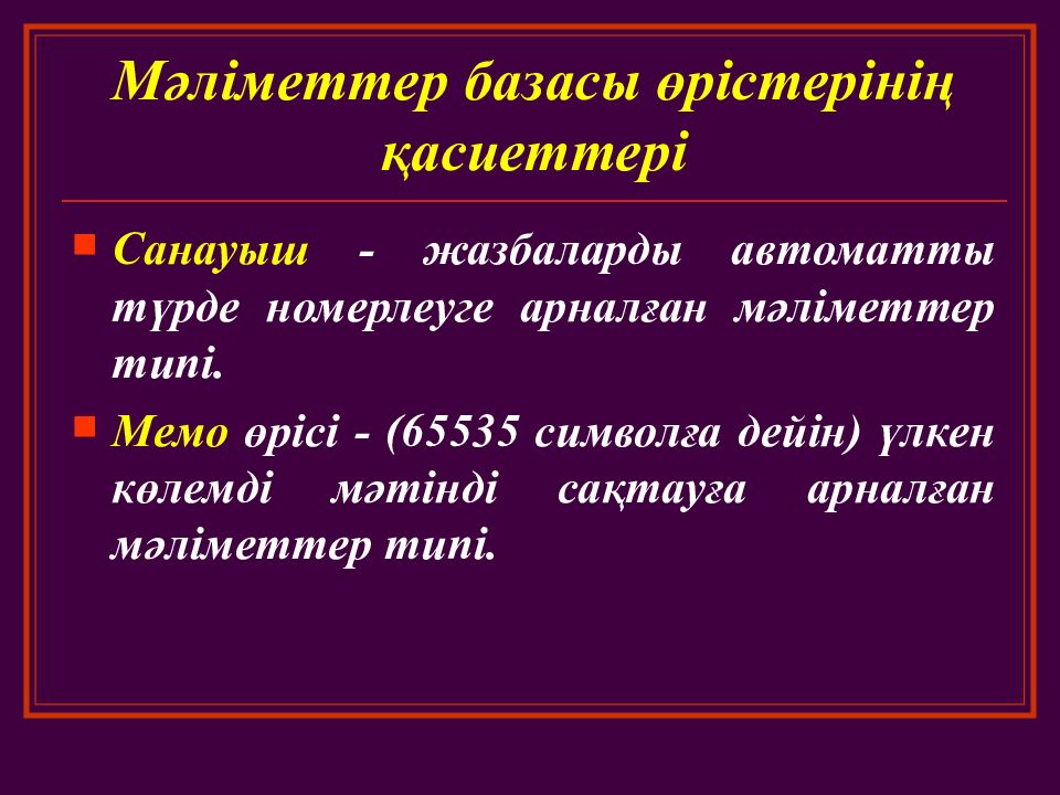 Мәліметтер базасы өрістерінің қасиеттері Санауыш - жазбаларды автоматты түрде номерлеуге арналған мәліметтер типі. Мемо өрісі - (65535 символға дейін) үлкен көлемді мәтінді сақтауға арналған мәліметтер типі.