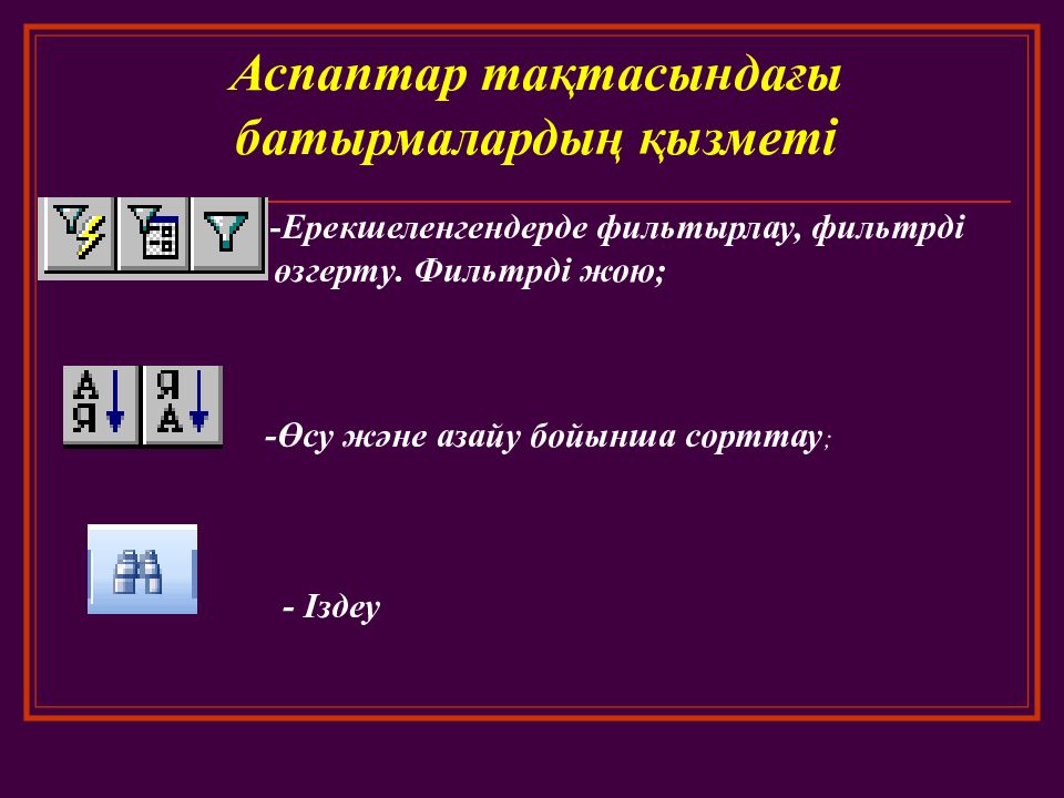 Аспаптар тақтасындағы батырмалардың қызметі - Ерекшеленгендерде фильтырлау, фильтр ді өзгерт у. Ф ильтр ді жою ; - Өсу және азайу бойынша сорттау ; - Іздеу