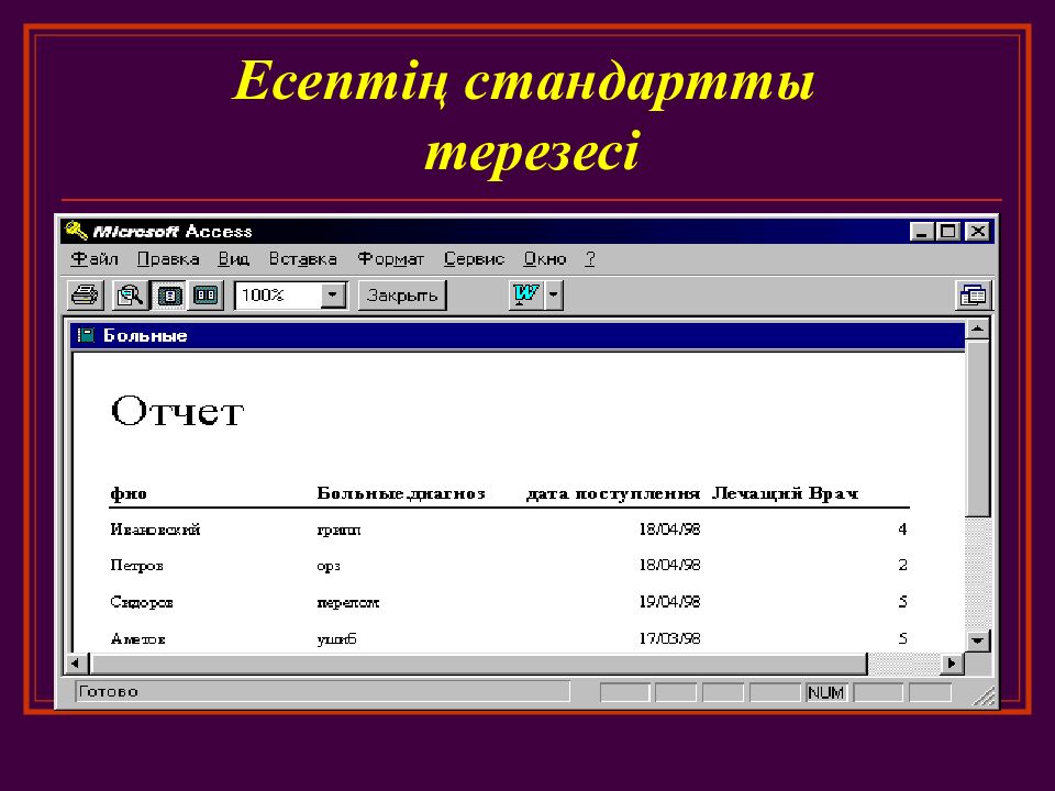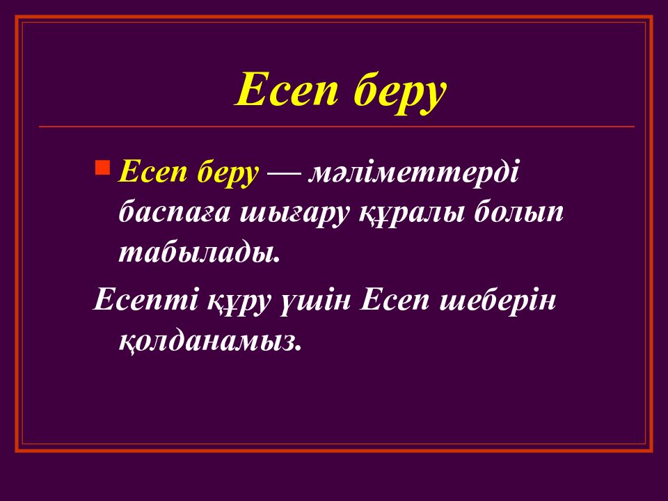 Есеп беру Есеп беру — мәліметтерді баспаға шығару құралы болып табылады. Есепті құру үшін Есеп шеберін қолданамыз.