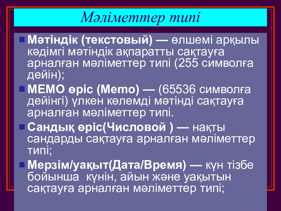 Мәліметтер типі Мәтіндік (текстовый) — өлшемі арқылы кәдімгі мәтіндік ақпаратты сақтауға арналған мәліметтер типі (255 символға дейін); МЕМО өріс (Memo) — (65536 символға дейінгі ) үлкен көлемді мәтінді сақтауға арналған мәліметтер типі. Сандық өріс(Числовой ) — нақты сандарды сақтауға арналған мәліметтер типі; Мерзім/уақыт(Дата/Время) — күн тізбе бойынша күнін, айын және уақытын сақтауға арналған мәліметтер типі;