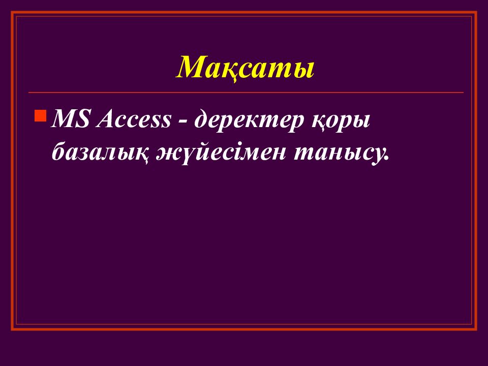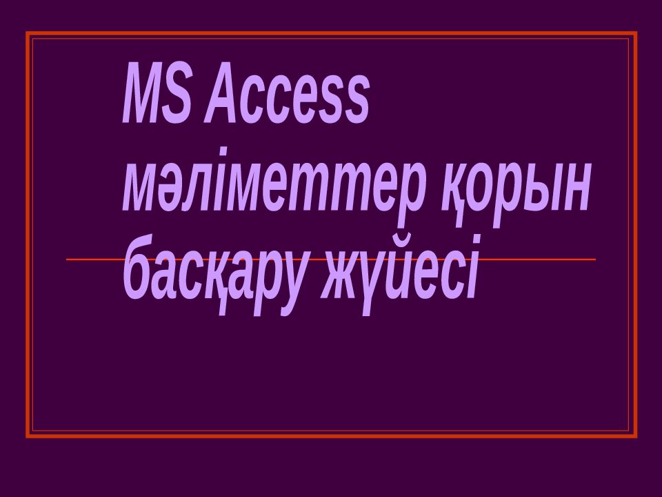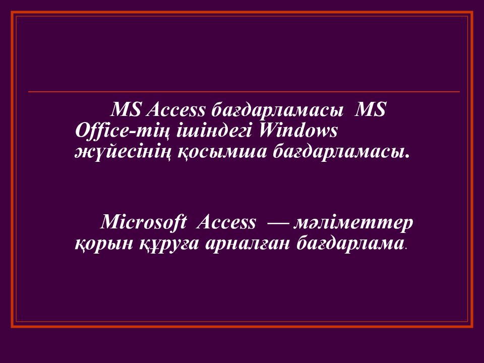 MS Access бағдарламасы MS Office -тің ішіндегі Windows жүйесінің қосымша бағдарламасы. Microsoft Access — мәліметтер қорын құруға арналған бағдарлама.