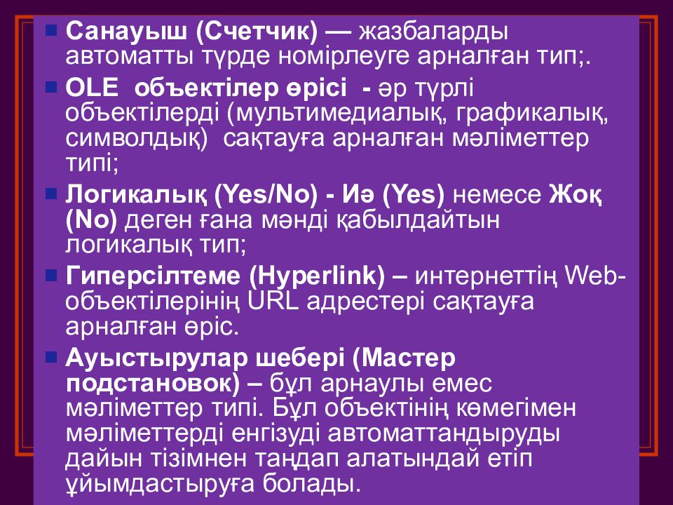 Санауыш (Счетчик) — жазбаларды автоматты түрде номірлеуге арналған тип;. OLE объектілер өрісі - әр түрлі объектілерді (мультимедиалық, графикалық, символдық) сақтауға арналған мәліметтер типі; Логикалық (Yes/No) - Иә (Yes) немесе Жоқ (No) деген ғана мәнді қабылдайтын логикалық тип; Гиперсілтеме (Нype rlink ) – интернеттің Web- объектілерінің URL адрестері сақтауға арналған өріс. Ауыстырулар шебері (Мастер подстановок) – бұл арнаулы емес мәліметтер типі. Бұл объектінің көмегімен мәліметтерді енгізуді автоматтандыруды дайын тізімнен таңдап алатындай етіп ұйымдастыруға болады.