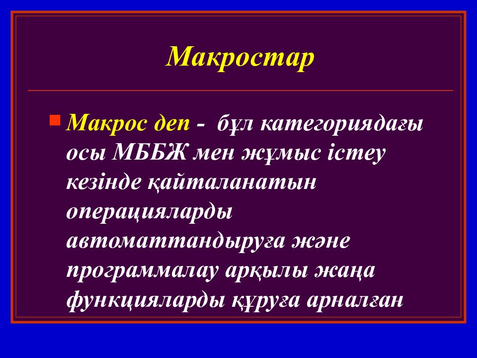 Макрос тар Макрос деп - бұл категориядағы осы МББЖ мен жұмыс істеу кезінде қайталанатын операцияларды автоматтандыруға және программалау арқылы жаңа функцияларды құруға арналған