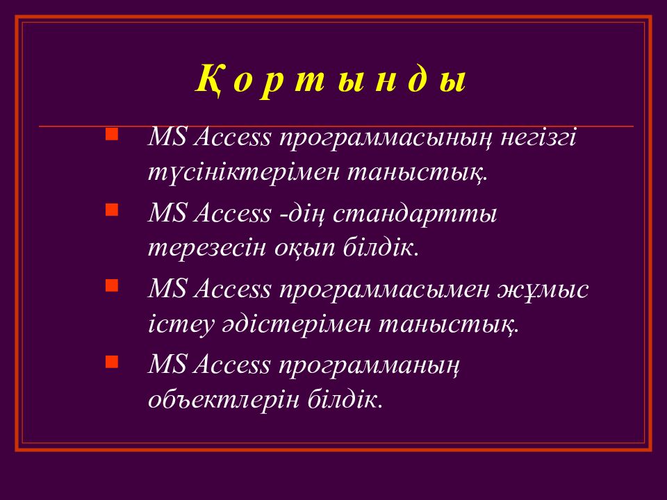 Қ о р т ы н д ы MS Access программасының негізгі түсініктерімен таныстық. MS Access -дің стандартты терезесін оқып білдік. MS Access программасымен жұмыс істеу әдістерімен таныстық. MS Access программаның объектлерін білдік.