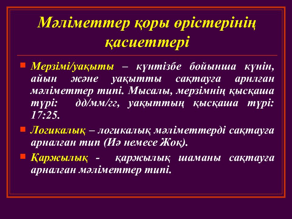 Мәліметтер қоры өрістерінің қасиеттері Мерзімі/уақыты – күнтізбе бойынша күнін, айын және уақытты сақтауға арнлған мәліметтер типі. Мысалы, мерзімнің қысқаша түрі: дд/мм/гг, уақыттың қысқаша түрі: 17:25. Логикалық – логикалық мәліметтерді сақтауға арналған тип (Иә немесе Жоқ). Қаржылық - қаржылық шаманы сақтауға арналған мәліметтер типі.