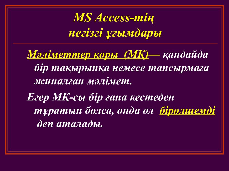 MS Access -тің негізгі ұғымдары Мәліметтер қоры ( М Қ) — қандайда бір тақырыпқа немесе тапсырмаға жиналған мәлімет. Егер МҚ-сы бір ғана кестеден тұратын болса, онда ол бірөлшемді деп аталады.