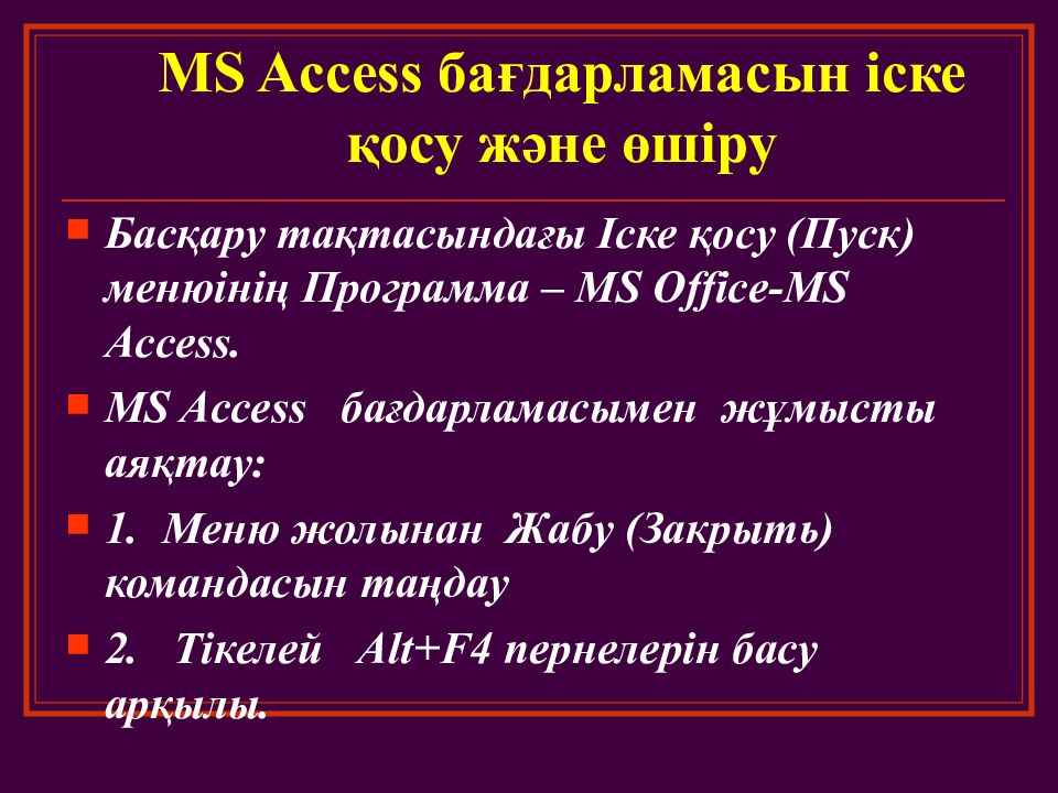 MS Access бағдарламасын іске қосу және өшіру Басқару тақтасындағы Іске қосу (Пуск) менюінің Программа – MS Office-MS Access. MS Access бағдарламасымен жұмысты аяқтау : 1. Меню жолынан Жабу ( Закрыть ) командасын таңдау 2. Тікелей Alt + F 4 пернелерін басу арқылы.