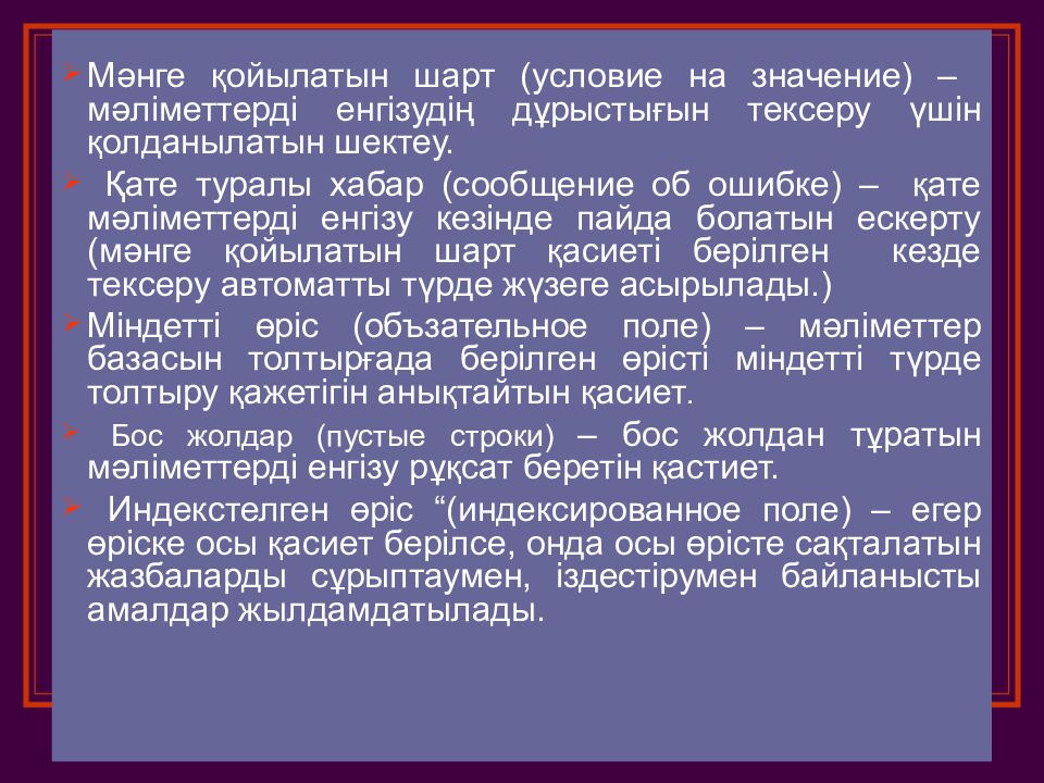 Мәнге қойылатын шарт (условие на значение) – мәліметтерді енгізудің дұрыстығын тексеру үшін қолданылатын шектеу. Қате туралы хабар (сообщение об ошибке) – қате мәліметтерді енгізу кезінде пайда болатын ескерту (мәнге қойылатын шарт қасиеті берілген кезде тексеру автоматты түрде жүзеге асырылады.) Міндетті өріс (объзательное поле) – мәліметтер базасын толтырғада берілген өрісті міндетті түрде толтыру қажетігін анықтайтын қасиет. Бос жолдар (пустые строки) – бос жолдан тұратын мәліметтерді енгізу рұқсат беретін қастиет. Индекстелген өріс “(индексированное поле) – егер өріске осы қасиет берілсе, онда осы өрісте сақталатын жазбаларды сұрыптаумен, іздестірумен байланысты амалдар жылдамдатылады.