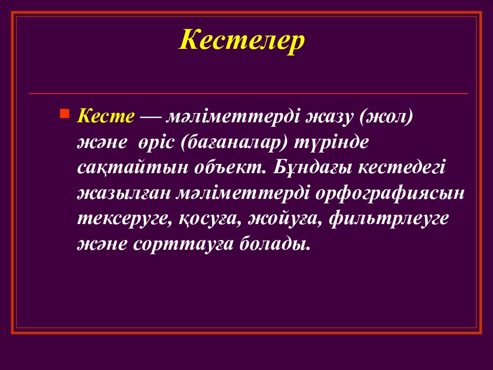 Кестелер Кесте — мәліметтерді жазу ( жол ) және өріс ( бағаналар ) түрінде сақтайтын объект. Бұндағы кестедегі жазылған мәліметтерді орфография сын тексеруге, қосуға, жойуға, фильтрлеуге және сорттауға болады.
