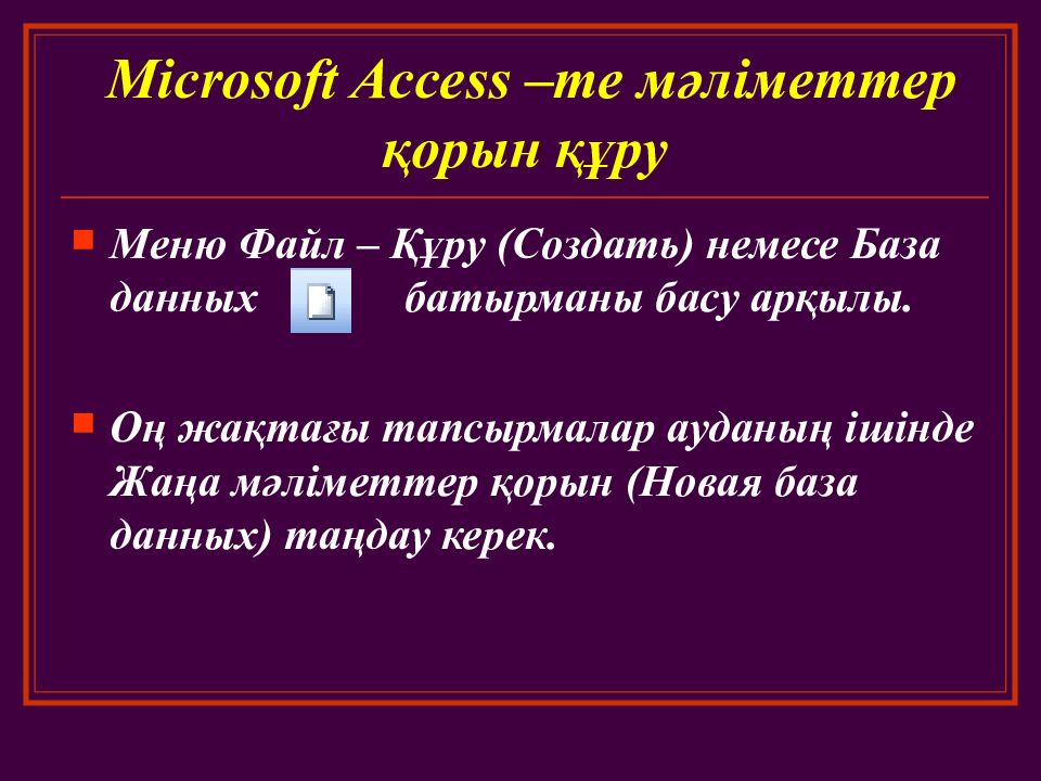Microsoft Access –те мәліметтер қорын құру Меню Файл – Құру (Создать) немесе База данных батырманы басу арқылы. Оң жақтағы тапсырмалар ауданың ішінде Жаңа мәліметтер қорын (Новая база данных) таңдау керек.