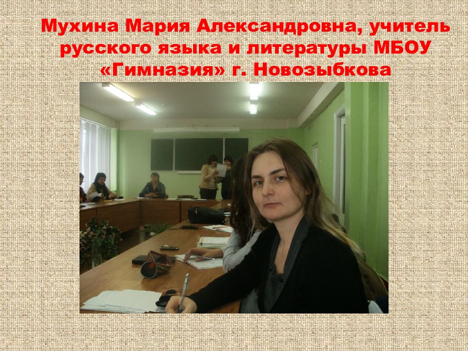 Первый слайд презентации: Мухина Мария Александровна, учитель русского языка и литературы МБОУ «Гимназия» г. Новозыбкова
