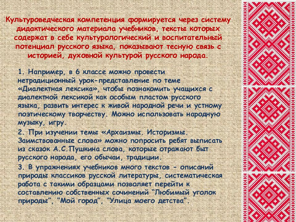 1. Например, в 6 классе можно провести нетрадиционный урок-представление по теме «Диалектная лексика», чтобы познакомить учащихся с диалектной лексикой как особым пластом русского языка, развить интерес к живой народной речи и устному поэтическому творчеству. Можно использовать народную музыку, игру. 2. При изучении темы «Архаизмы. Историзмы. Заимствованные слова» можно попросить ребят выписать из сказок А.С.Пушкина слова, которые отражают быт русского народа, его обычаи, традиции. 3. В упражнениях учебников много текстов - описаний природы классиков русской литературы, систематическая работа с такими образцами позволяет перейти к составлению собственных сочинений “Любимый уголок природы”, “Мой город”, “Улица моего детства”. Культуроведческая компетенция формируется через систему дидактического материала учебников, тексты которых содержат в себе культурологический и воспитательный потенциал русского языка, показывают тесную связь с историей, духовной культурой русского народа.