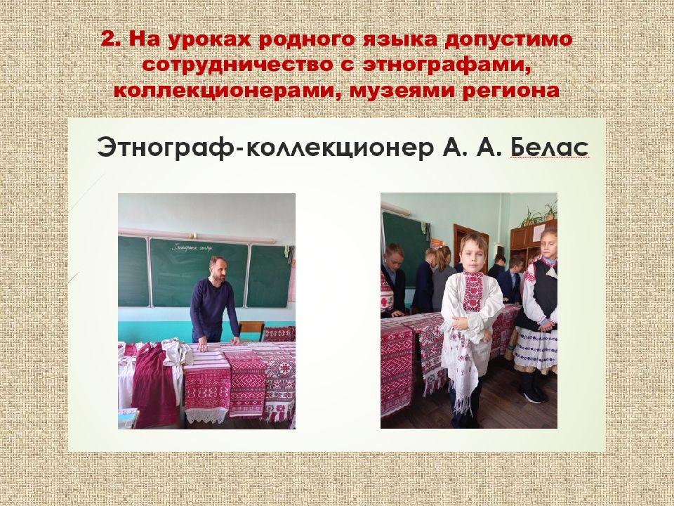 Слайд 8: 2. На уроках родного языка допустимо сотрудничество с этнографами, коллекционерами, музеями региона