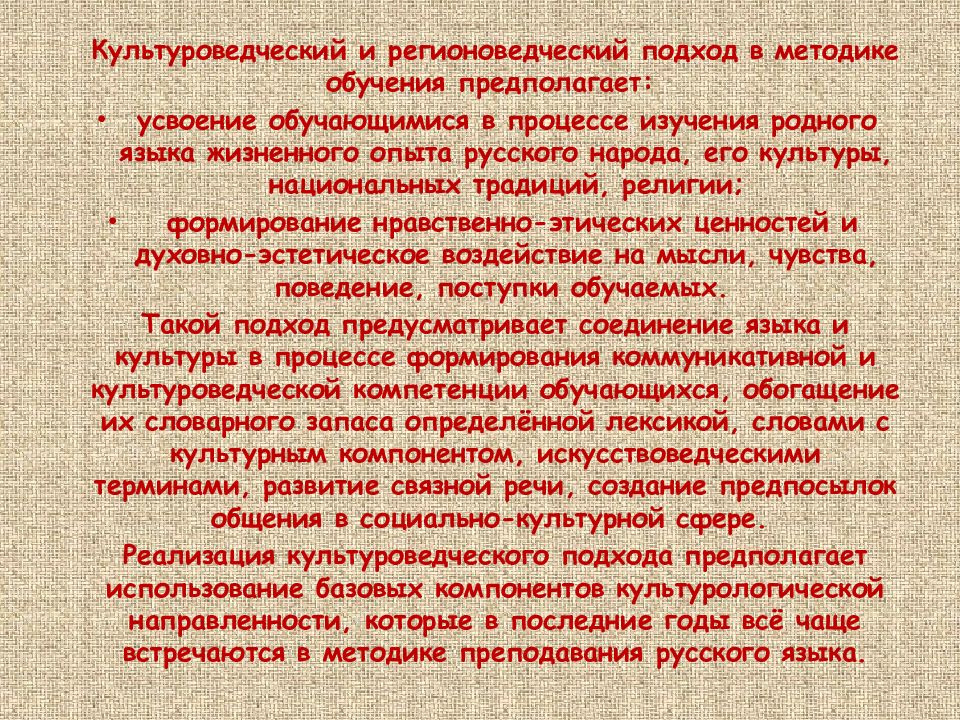 Культуроведческий и регионоведческий подход в методике обучения предполагает: усвоение обучающимися в процессе изучения родного языка жизненного опыта русского народа, его культуры, национальных традиций, религии; формирование нравственно-этических ценностей и духовно-эстетическое воздействие на мысли, чувства, поведение, поступки обучаемых. Такой подход предусматривает соединение языка и культуры в процессе формирования коммуникативной и культуроведческой компетенции обучающихся, обогащение их словарного запаса определённой лексикой, словами с культурным компонентом, искусствоведческими терминами, развитие связной речи, создание предпосылок общения в социально-культурной сфере. Реализация культуроведческого подхода предполагает использование базовых компонентов культурологической направленности, которые в последние годы всё чаще встречаются в методике преподавания русского языка.