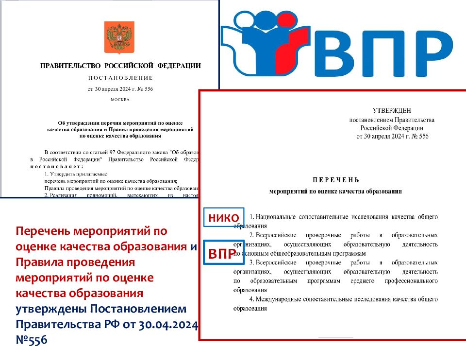 Перечень мероприятий по оценке качества образования и Правила проведения мероприятий по оценке качества образования утверждены Постановлением Правительства РФ от 30.04.2024 №556 ВПР НИКО