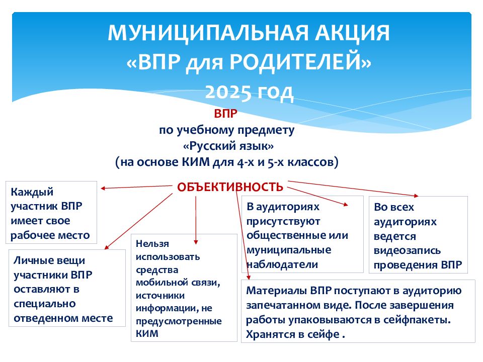 МУНИЦИПАЛЬНАЯ АКЦИЯ «ВПР для РОДИТЕЛЕЙ» 20 2 5 год ВПР по учебному предмету «Русский язык» (на основе КИМ для 4-х и 5-х классов) ОБЪЕКТИВНОСТЬ Каждый участник ВПР имеет свое рабочее место Личные вещи участники ВПР оставляют в специально отведенном месте Нельзя использовать средства мобильной связи, источники информации, не предусмотренные КИМ Во всех аудиториях ведется видеозапись проведения ВПР В аудиториях присутствуют общественные или муниципальные наблюдатели Материалы ВПР поступают в аудиторию запечатанном виде. После завершения работы упаковываются в сейфпакеты. Хранятся в сейфе.