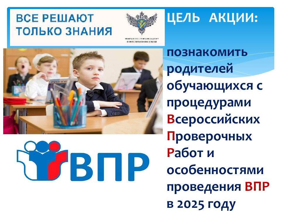 ЦЕЛЬ АКЦИИ: познакомить родителей обучающихся с процедурами В сероссийских П роверочных Р абот и особенностями проведения ВПР в 2025 году