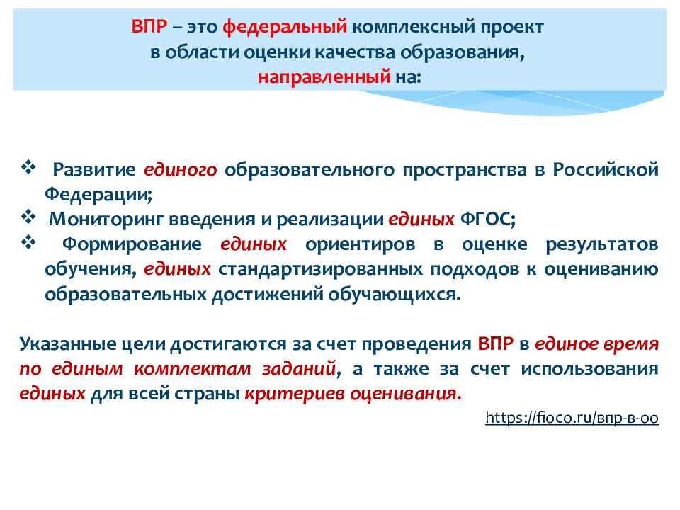 Р азвитие единого образовательного пространства в Российской Федерации; Мониторинг введения и реализации единых ФГОС; Формирование единых ориентиров в оценке результатов обучения, единых стандартизированных подходов к оцениванию образовательных достижений обучающихся. Указанные цели достигаются за счет проведения ВПР в единое время по единым комплектам заданий, а также за счет использования единых для всей страны критериев оценивания. https ://fioco.ru/ впр -в- оо ВПР – это федеральный комплексный проект в области оценки качества образования, направленный на: