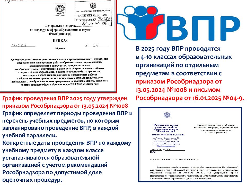 В 2025 году ВПР проводятся в 4-10 классах образовательных организаций по отдельным предметам в соответствии с приказом Рособрнадзора от 13.05.2024 №1008 и письмом Рособрнадзора от 16.01.2025 № 04-9. График проведения ВПР 2025 году утвержден приказом Рособрнадзора от 13.05.2024 №1008 График определяет периоды проведения ВПР и перечень учебных предметов, по которым запланировано проведение ВПР, в каждой учебной параллели. Конкретные даты проведения ВПР по каждому учебному предмету в каждом классе устанавливаются образовательной организацией с учетом рекомендаций Рособрнадзора по допустимой доле оценочных процедур.