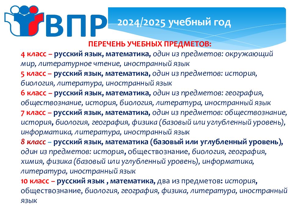 ПЕРЕЧЕНЬ УЧЕБНЫХ ПРЕДМЕТОВ: 4 класс – русский язык, математика, один из предметов: окружающий мир, литературное чтение, иностранный язык 5 класс – русский язык, математика, один из предметов: история, биология, литература, иностранный язык 6 класс – русский язык, математика, один из предметов: география, обществознание, история, биология, литература, иностранный язык 7 класс – русский язык, математика, один из предметов: обществознание, история, биология, география, физика (базовый или углубленный уровень), информатика, литература, иностранный язык 8 класс – русский язык, математика (базовый или углубленный уровень), один из предметов: история, обществознание, биология, география, химия, физика (базовый или углубленный уровень), информатика, литература, иностранный язык 10 класс – русский язык, математика, два из предметов : история, обществознание, биология, география, физика, литература, иностранный язык 2024/2025 учебный год
