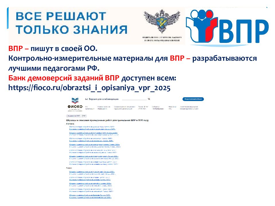 Слайд 9: ВПР – пишут в своей ОО. Контрольно-измерительные материалы для ВПР – разрабатываются лучшими педагогами РФ. Банк демоверсий заданий ВПР доступен всем: https://fioco.ru/obraztsi i opisaniya vpr 2025