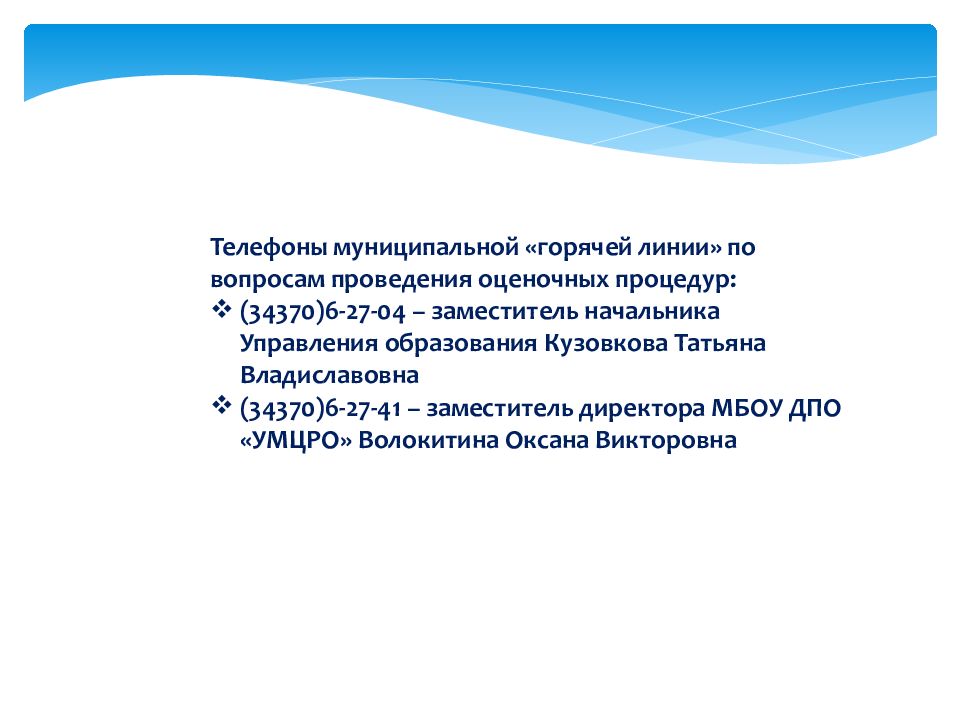 Телефоны муниципальной «горячей линии» по вопросам проведения оценочных процедур: (34370)6-27-04 – заместитель начальника Управления образования Кузовкова Татьяна В ладиславовна (34370)6-27-41 – заместитель директора МБОУ ДПО «УМЦРО» Волокитина Оксана В икторовна