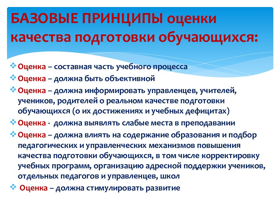 Оценка – составная часть учебного процесса Оценка – должна быть объективной Оценка – должна информировать управленцев, учителей, учеников, родителей о реальном качестве подготовки обучающихся (о их достижениях и учебных дефицитах) Оценка - должна выявлять слабые места в преподавании Оценка – должна влиять на содержание образования и подбор педагогических и управленческих механизмов повышения качества подготовки обучающихся, в том числе корректировку учебных программ, организацию адресной поддержки учеников, отдельных педагогов и управленцев, школ Оценка – должна стимулировать развитие БАЗОВЫЕ ПРИНЦИПЫ оценки качества подготовки обучающихся: