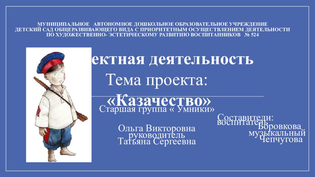 Проектная деятельность Тема проекта: «Казачество» Старшая группа « Умники» Составители: воспитатель Боровкова Ольга Викторовна музыкальный руководитель Чепчугова Татьяна Сергеевна