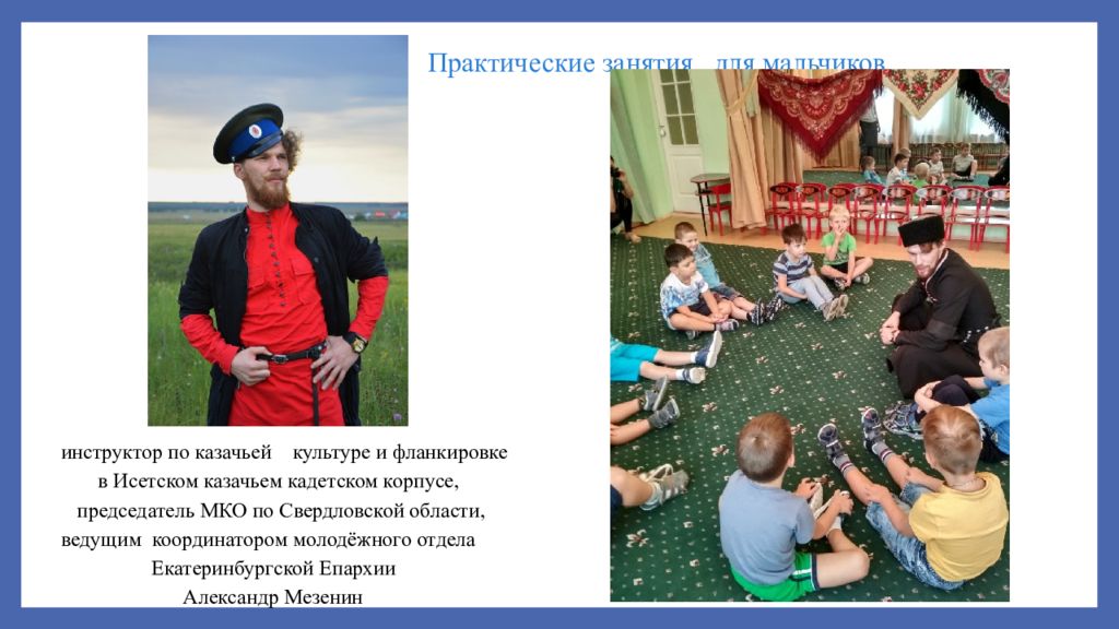 Практические занятия для мальчиков инструктор по казачьей культуре и фланкировке в Исетском казачьем кадетском корпусе, председатель МКО по Свердловской области, ведущим координатором молодёжного отдела Екатеринбургской Епархии Александр Мезенин