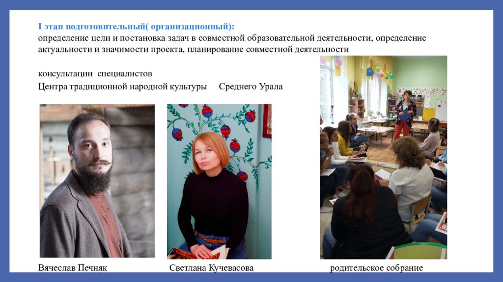 I этап подготовительный( организационный): определение цели и постановка задач в совместной образовательной деятельности, определение актуальности и значимости проекта, планирование совместной деятельности консультации специалистов Центра традиционной народной культуры Среднего Урала Вячеслав Печняк Светлана Кучевасова родительское собрание