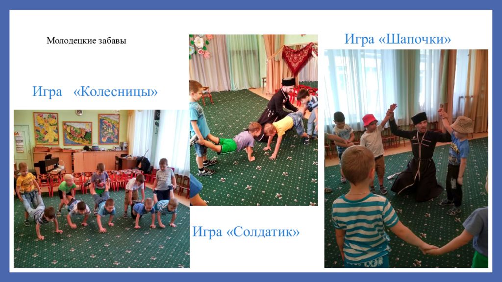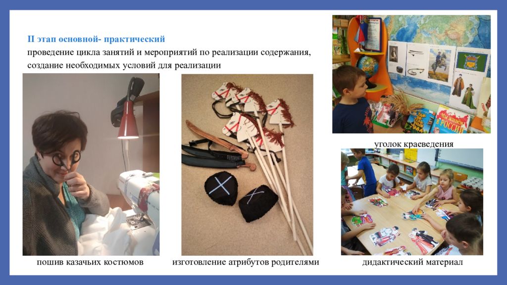 II этап основной- практический проведение цикла занятий и мероприятий по реализации содержания, создание необходимых условий для реализации уголок краеведения п ошив казачьих костюмов изготовление атрибутов родителями дидактический материал